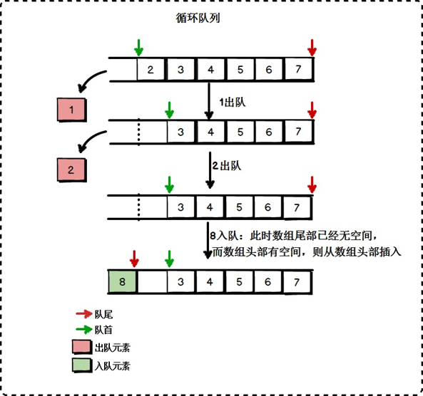 如果以数组为基础,一般会把队列设置成循环队列,循环队列也被称为“环形缓冲区”,因为如果队列中的元素出队,则需要把该元素的后继元素整体向前移动,这时时间复杂度为O(n)。