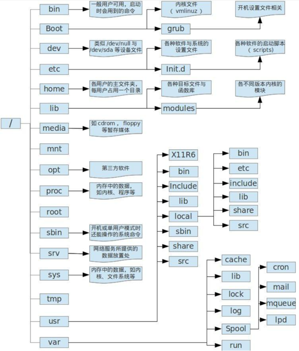 文件系统的最顶层是由根目录开始的,系统使用“/”来表示根目录,在根目录之下的既可以是目录(相当于windows中的文件夹),也可以是文件,而每一个目录中又可以包含子目录或文件,如此反复就可以构成一个庞大的文件系统。
