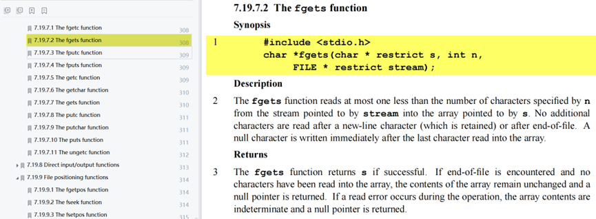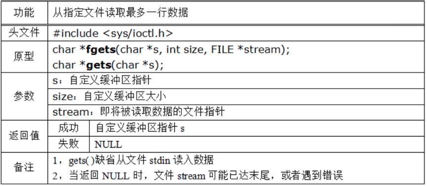 标准库中提供了一个fgets函数,通过C99标准可以知道该函数的作用是从文件指针stream指向的文件中读取一行字符,并把读取的字符存储在指针s所指向的字符串内,当读取到n-1个字符、或者已经读取到文件末尾(EOF)、或者读取到换行符’\n’时,则函数调用停止。